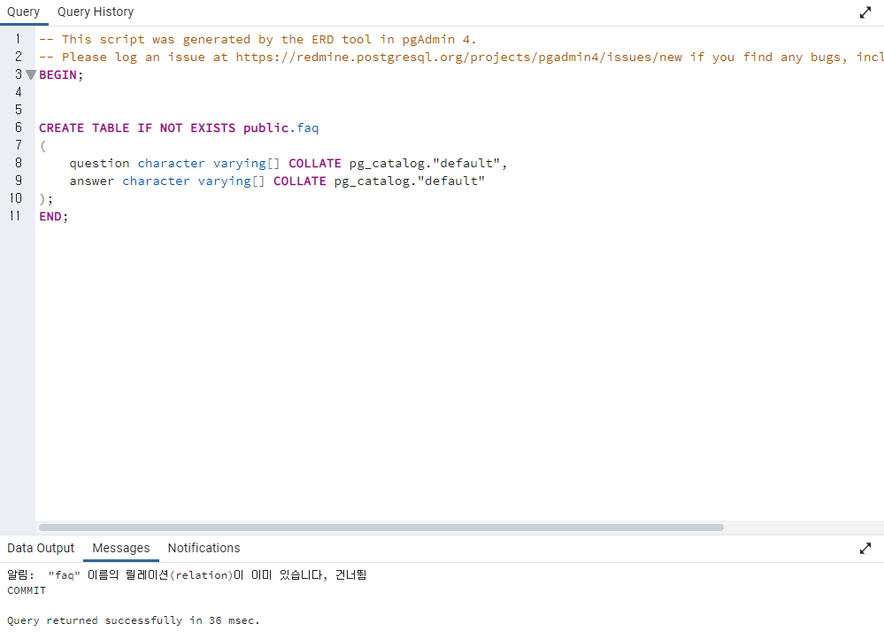 chatGPT와 연결하기 위해 faq라는 테이블을 만들어 테스트를 해보려고 PostgreSQL에서 ERD를 그리고 아래와 같이 테이블 생성을 했습니다.