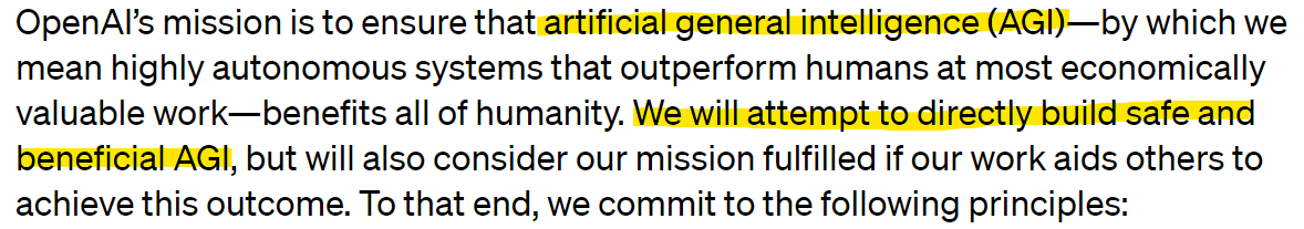 OpenAI의 mission은 AGI(Artificial General Intelligence)를 보증하는 것으로 인간이 할 수 있는 모든 일을 안전하게~ 모든 인류에게 이익이(Beneficial) 될 수 있게 하겠다는 것이거든요.