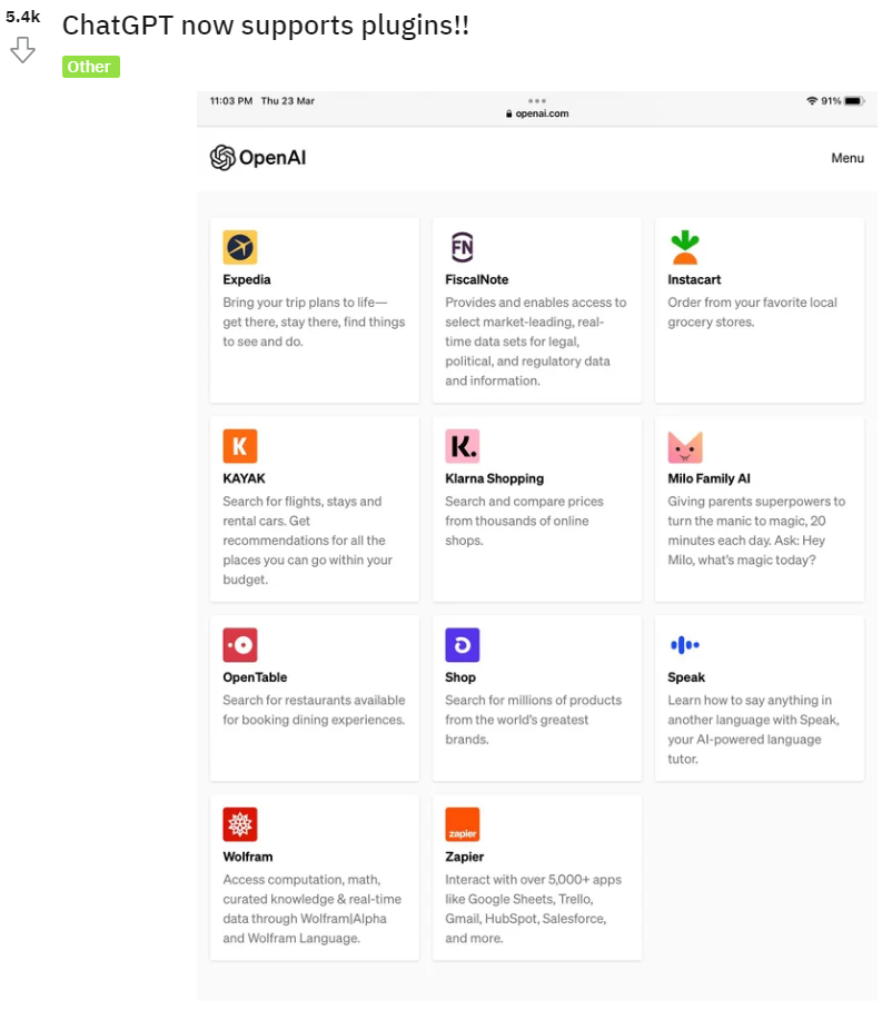 ChatGPT reddit에 3월 24일자로 ChatGPT가 plugin들을 지원한다는 포스팅을 보게됐습니다.